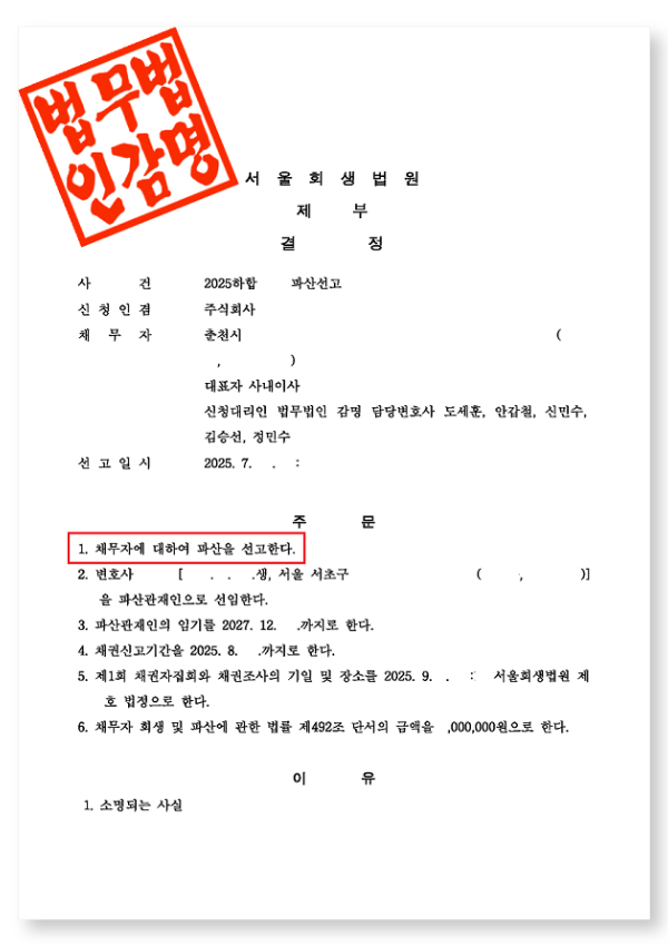 법무법인 감명의 체계적인 조력으로 법원은 해당 법인에 대해 파산선고를 내렸습니다.