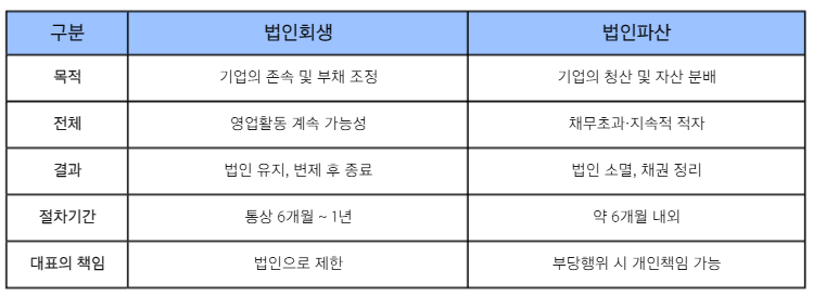 결국 법인회생과 파산의 차이는 ‘회복 가능성’에 있으며,